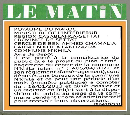ينهى إلى علم العموم أن مشروع تصميم تهيئة مركز جماعة النخيلة رقم 04/2022 وضابطته، قد تم إيداعه بمقر الجماعة وذلك خلال فترة مدتها شهرا واحدا تبتدئ من 16 يناير 2023 وأن ملفا وسجلا سيوضعان لهذا الغرض في متناول العموم قصد إدراج ملاحظاتهم وذلك بنفس المقر وأثناء أوقات العمل الرسمية.