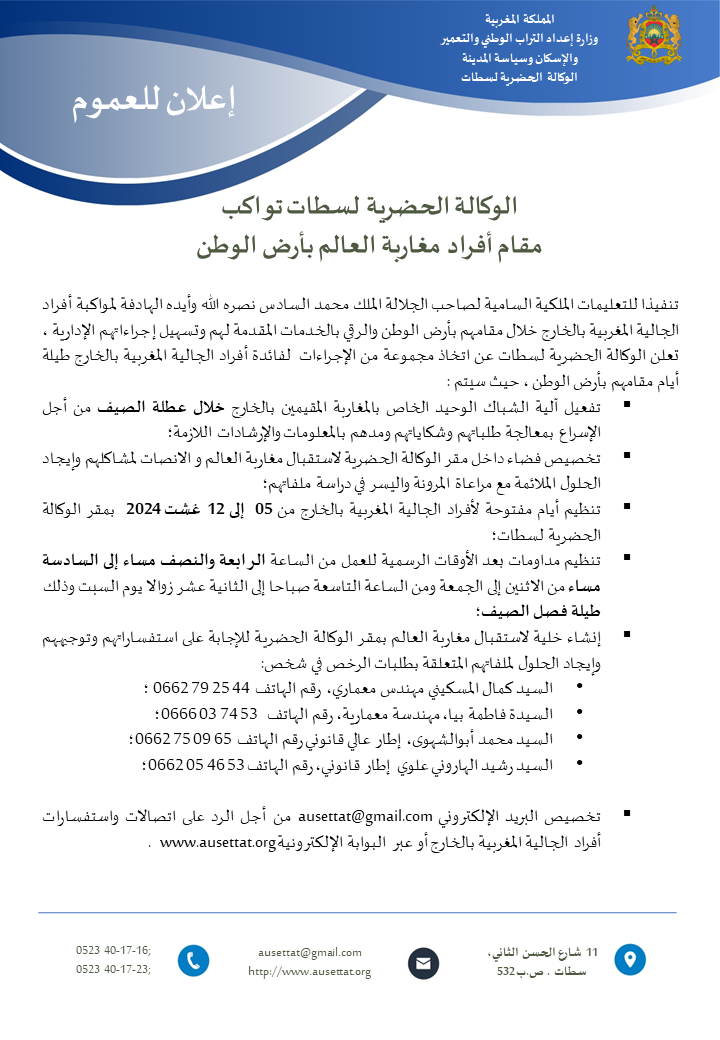 الوكالة الحضرية لسطات تواكب مقام أفراد مغاربة العالم بأرض الوطن - AUSETTAT